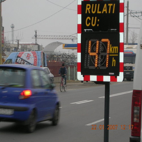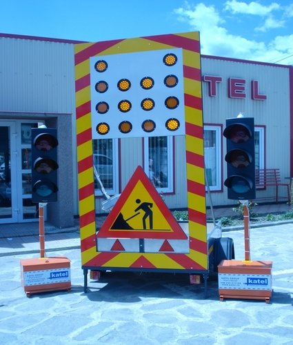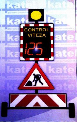 Radar to calm the traffic; - Bright structure composed of semi-trailers, road sign, radar speed control, and traffic light with yellow blinking light for warning. |